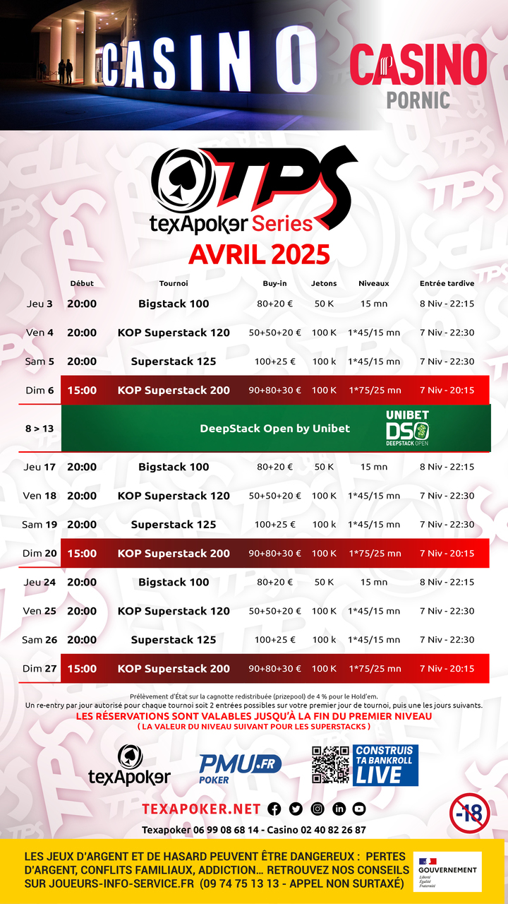 ¡El TPS es la marca distintiva de Texapoker! Al igual que en todos los torneos TPS, los tickets ganados en PMU.fr se pueden utilizar en cualquier torneo.
