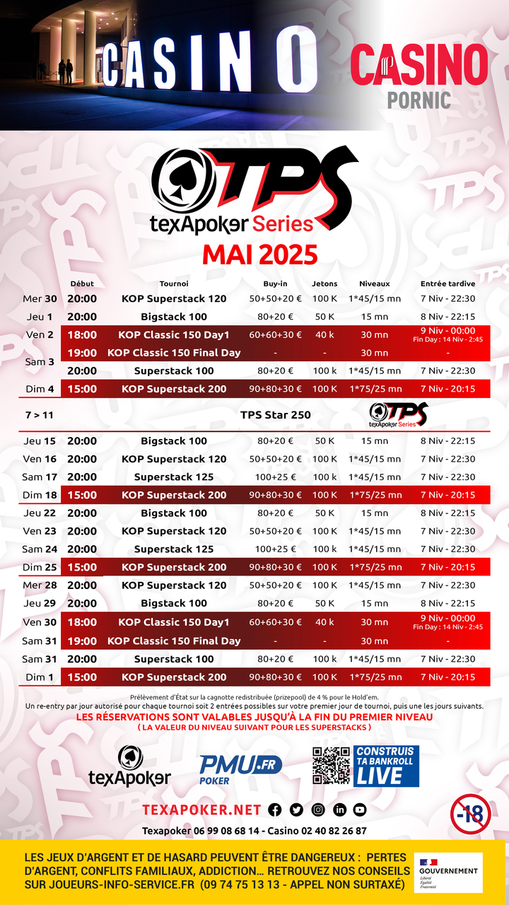 ¡El TPS es la marca distintiva de Texapoker! Al igual que en todos los torneos TPS, los tickets ganados en PMU.fr se pueden utilizar en cualquier torneo.