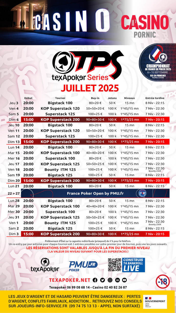 ¡El TPS es la marca distintiva de Texapoker! Al igual que en todos los torneos TPS, los tickets ganados en PMU.fr se pueden utilizar en cualquier torneo.