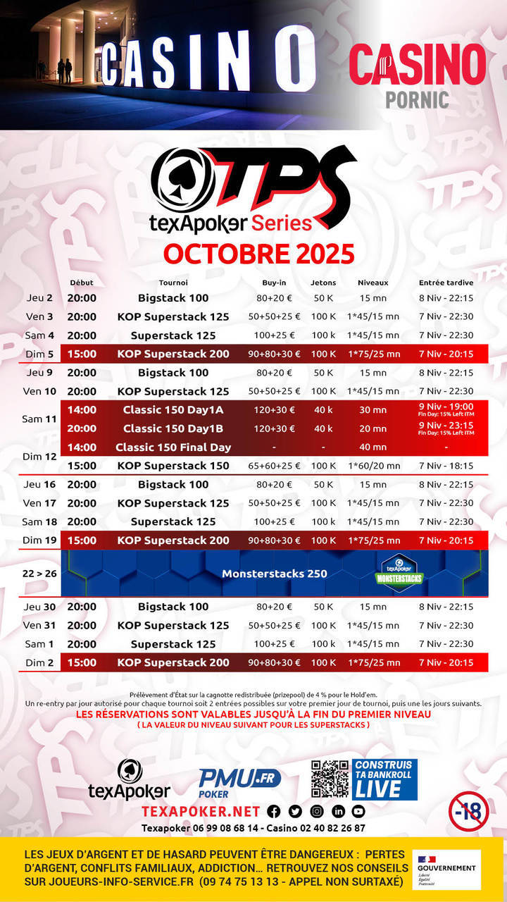 Descubre los torneos semanales en el Casino de Pornic. Encontrarás una variedad de eventos, incluidos Bigstack de 100€, y Classic 150€, así como KO Superstack de 125€ y 200€!