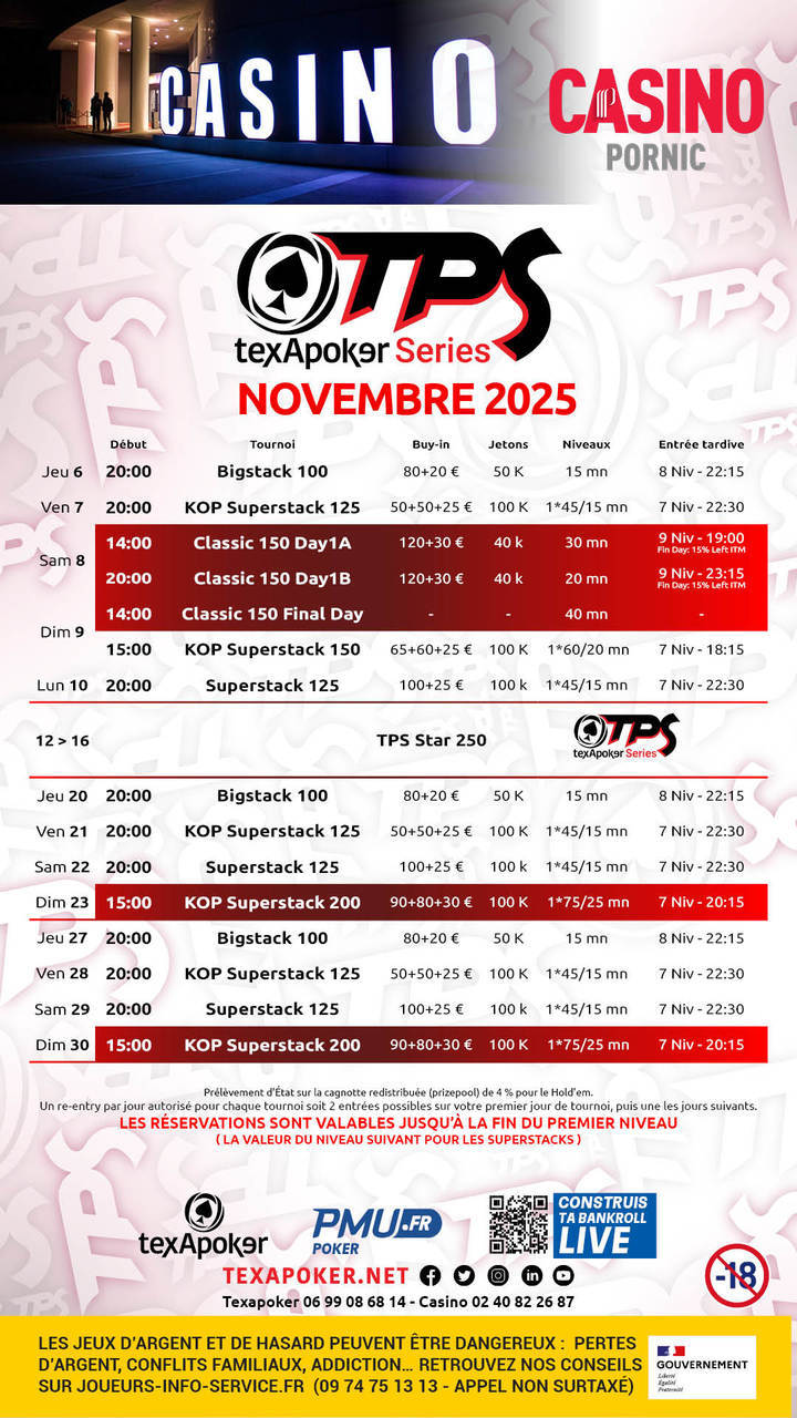 ¡El TPS es la marca distintiva de Texapoker! Al igual que en todos los torneos TPS, los tickets ganados en PMU.fr se pueden utilizar en cualquier torneo.