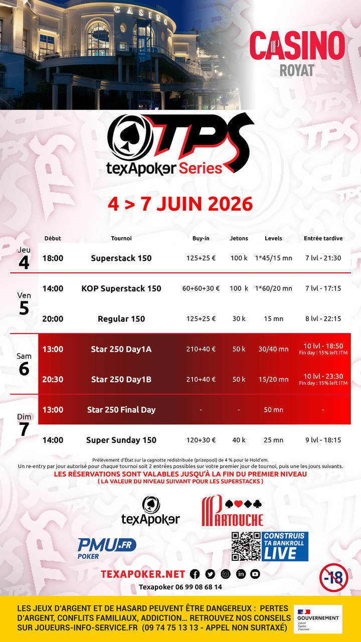Por último, de vuelta al casino Royat, encontrará el Star 250, el torneo estrella de Texapoker, así como un Superstack 150, un KO Progressive 150, un Regular 150 y un Super Sunday 150.