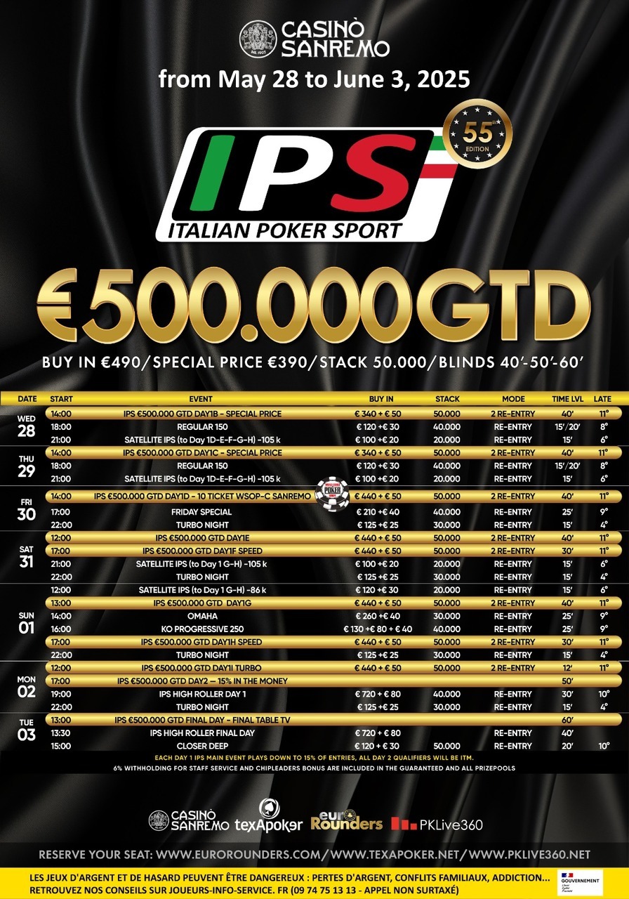 El Evento Principal consta de un torneo con un buy-in de 490 euros (390 euros para el Día 1A, B y C), una pila inicial de 50.000 fichas y niveles de 40, 50 y 60 minutos. Se sortearán 10 entradas para las WSOP-C de Sanremo en el Día 1D del viernes 30 de mayo.