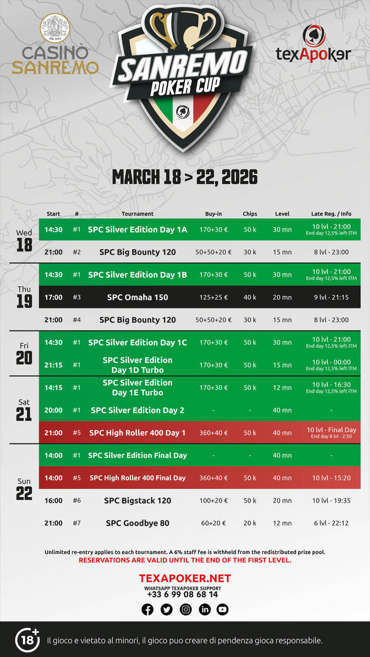Durante esta semana, participa en el Main Event de la Sanremo Poker Cup por 200 €, con 5 días 1, un stack inicial de 50 000 fichas y niveles de 30 y 40 minutos. Se organizarán varios torneos paralelos, entre los que destacan el Big Bounty de 120 €, el SPC Omaha de 150 €, el High Roller de 400 € y el Bigstack de 120 €, acompañados de un SPC Goodbye, que pondrán el broche de oro a este festival en el casino de Sanremo.