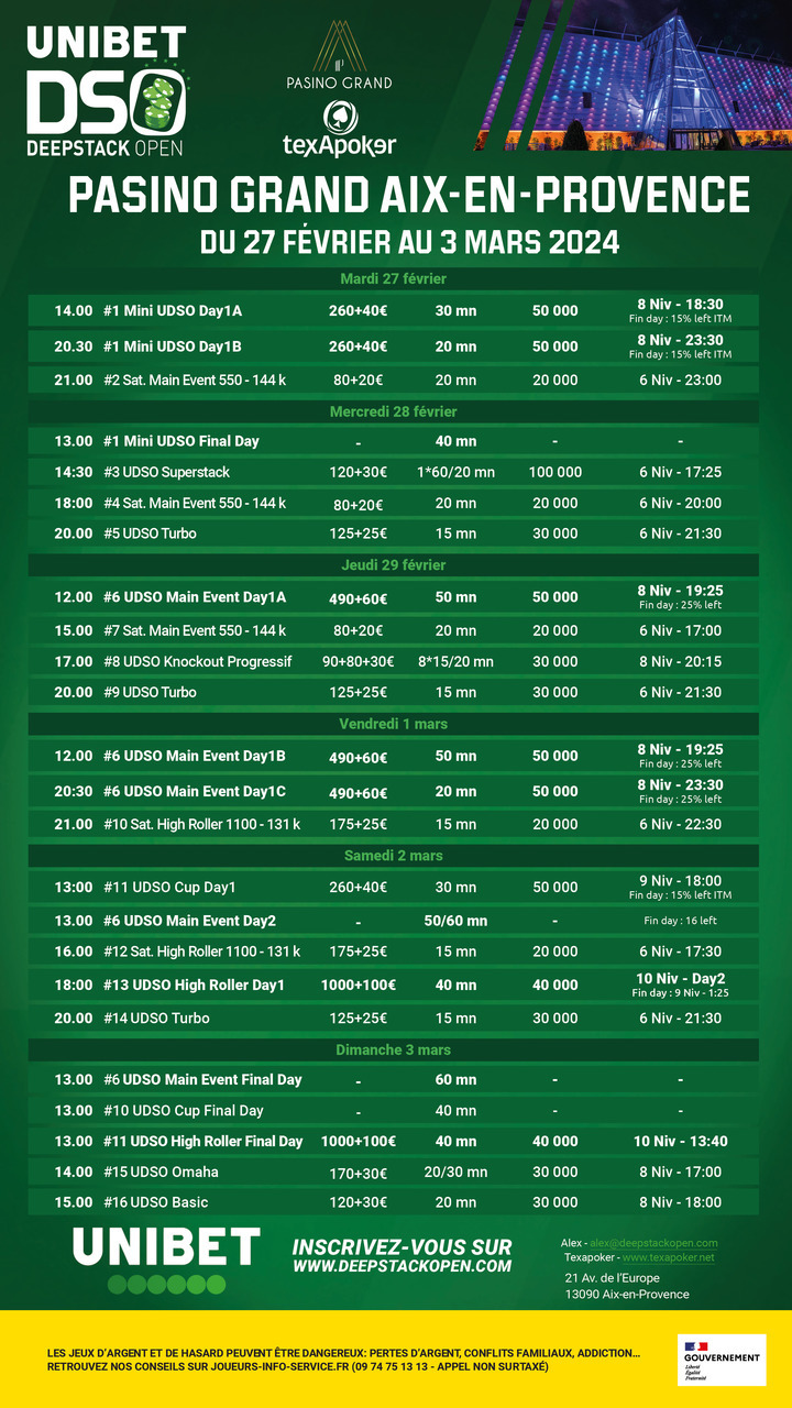 Les Unibet DeepStack Open sont de retour pour 2024, et toujours en partenariat avec Texapoker ! La première étape de ce circuit se déroulera au Pasino Grand d'Aix-en-Provence