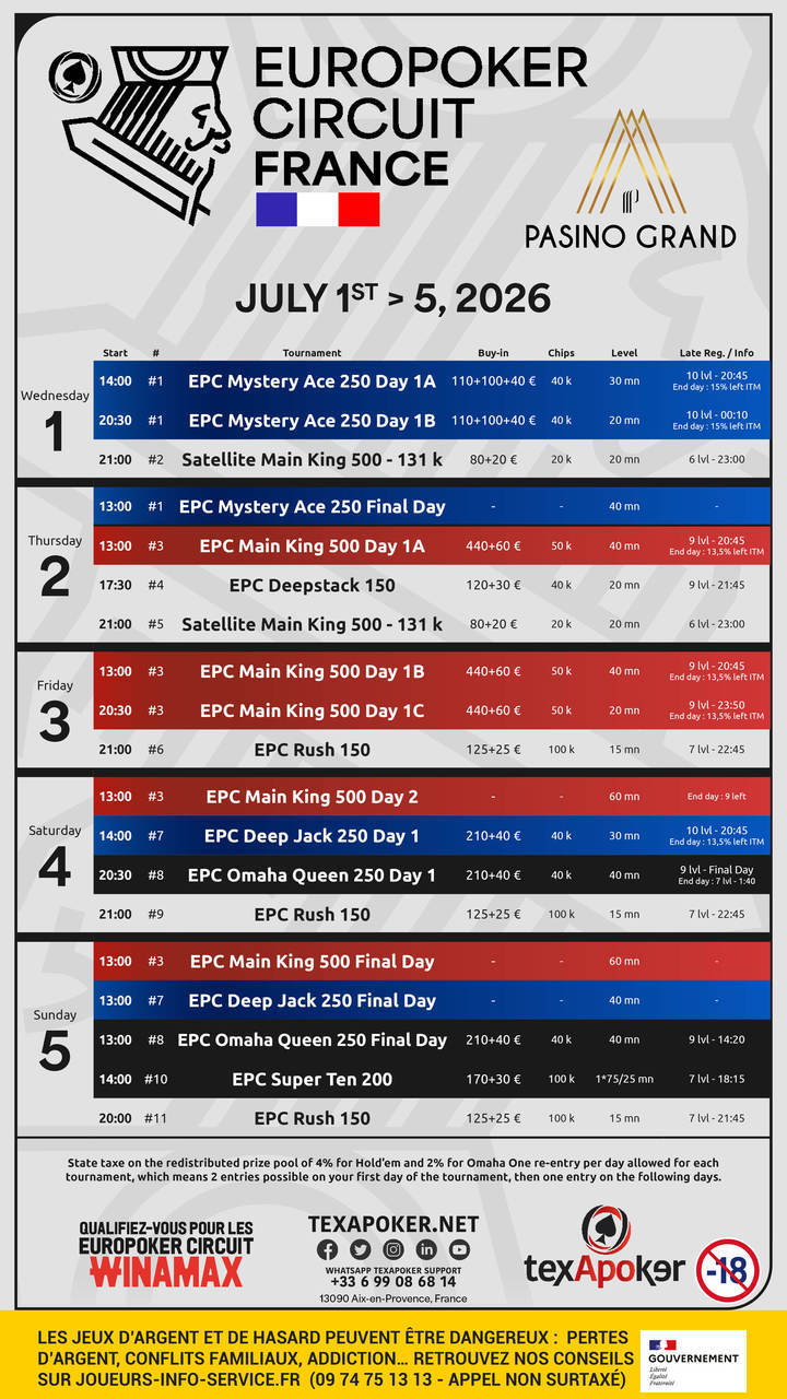 Du 1er au 6 juillet, l'EuroPoker Circuit France proposera un festival articulé autour de 5 tournois “Ace, King, Queen, Jack, Ten” aux droits d’entrée et formats différents. Partenaire de l'EPC, Winamax propose des qualifications en ligne chaque mardi à 21h15 avec un Satellite à 50€ pour 500€ de Bankroll Live.
