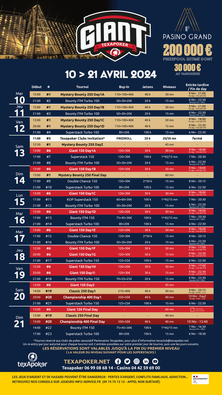 Après le succès du Giant en 2022, le Pasino Grand et Texapoker sont de retour avec une formule gagnante d'un festival populaire avec une très grosse fréquentation attendue, et une structure digne des plus grands tournois !