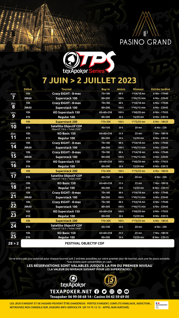 Chaque semaine du mercredi au dimanche, retrouvez divers tournois tels que les Crazy 8, Superstack 100 et 200, le KO Superstack 150, ainsi qu'un  KO Basic 150 et des Regular 100