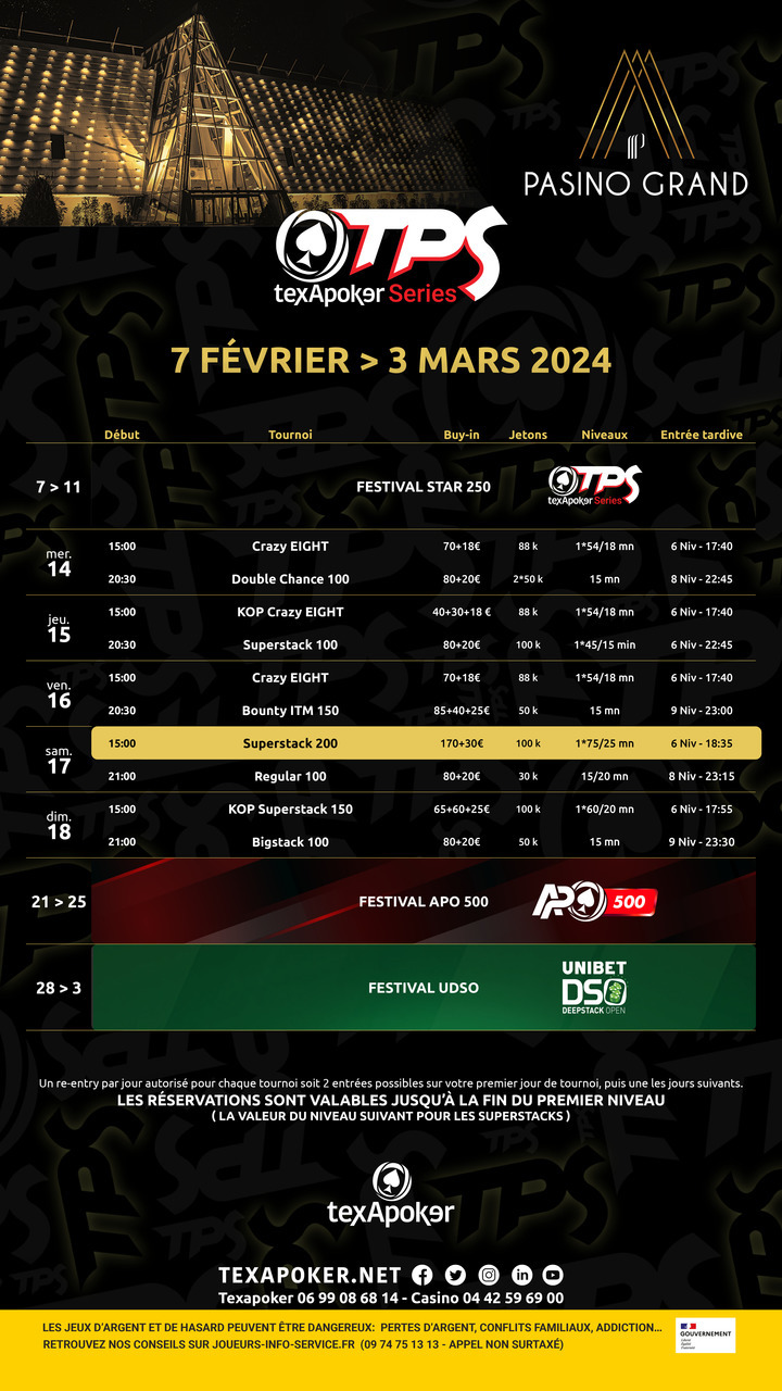 Le TPS est la marque de fabrique de Texapoker ! En partenariat avec PMU.fr, les tickets remportés sur PMU.fr sont utilisables sur l'ensemble des tournois.