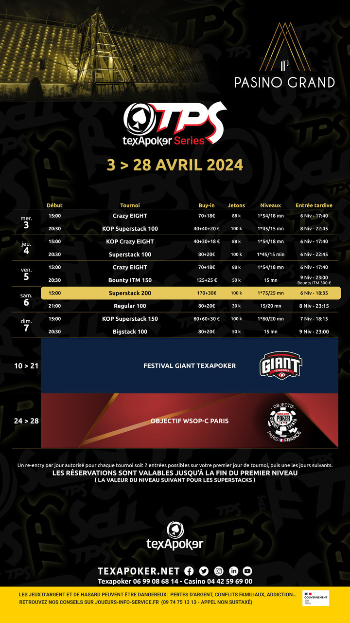 Le TPS est la marque de fabrique de Texapoker ! En partenariat avec PMU.fr, les tickets remportés sur PMU.fr sont utilisables sur l'ensemble des tournois.