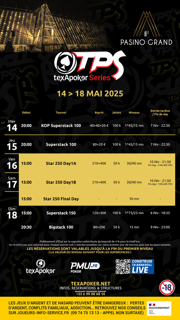 Les tournois TPS sont la marque de fabrique de Texapoker ! Comme sur tous les tournois TPS, les tickets remportés sur PMU.fr sont utilisables sur l'ensemble des tournois.