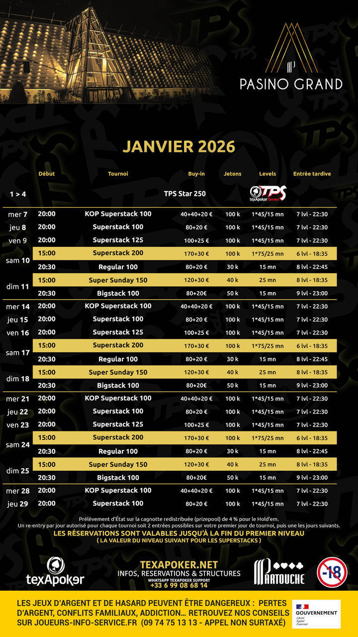 Chaque semaine du mercredi au dimanche, retrouvez divers tournois tels que les Superstack 100, 125 et 200, le KOP Superstack 100, ainsi qu'un Regular 100, le Super Sunday 150 et un Bigstack 100 !