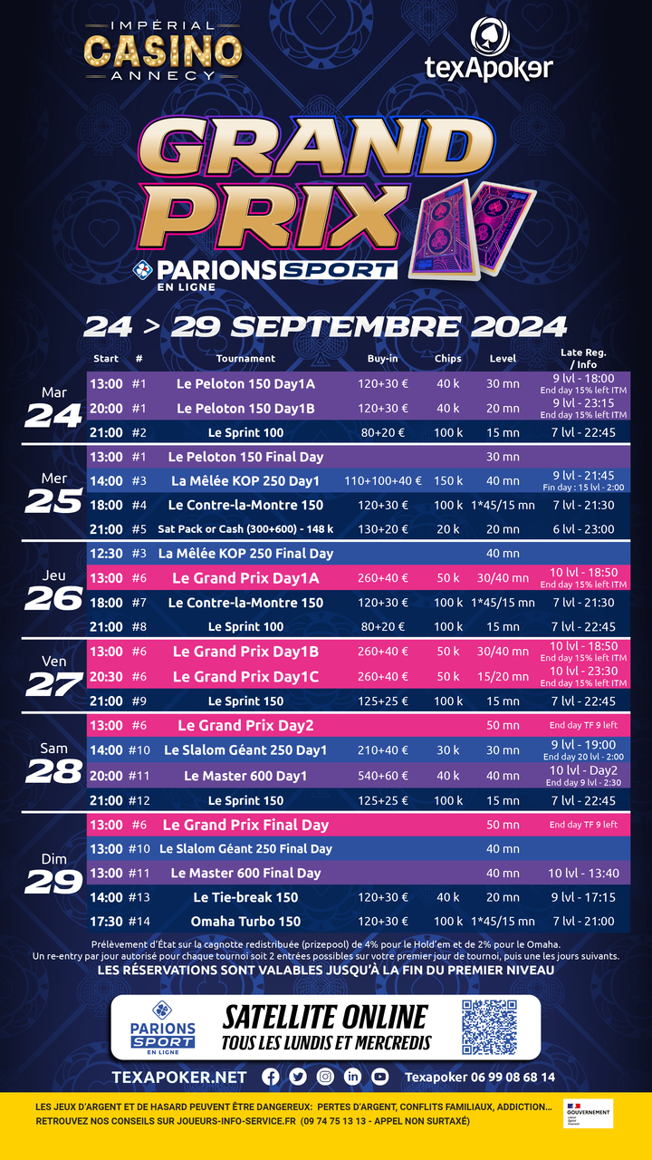 Le festival inaugural se déroulera du 24 au 29 septembre 2024 au Casino Impérial d’Annecy sur six jours avec un Main Event au droit d’entrée de 300 euros. S’appuyant sur son savoir-faire démontré, les équipes de Texapoker ont articulé chaque événement autour d’un programme riche et varié proposant des tournois pour tous les joueurs aux structures de qualité.