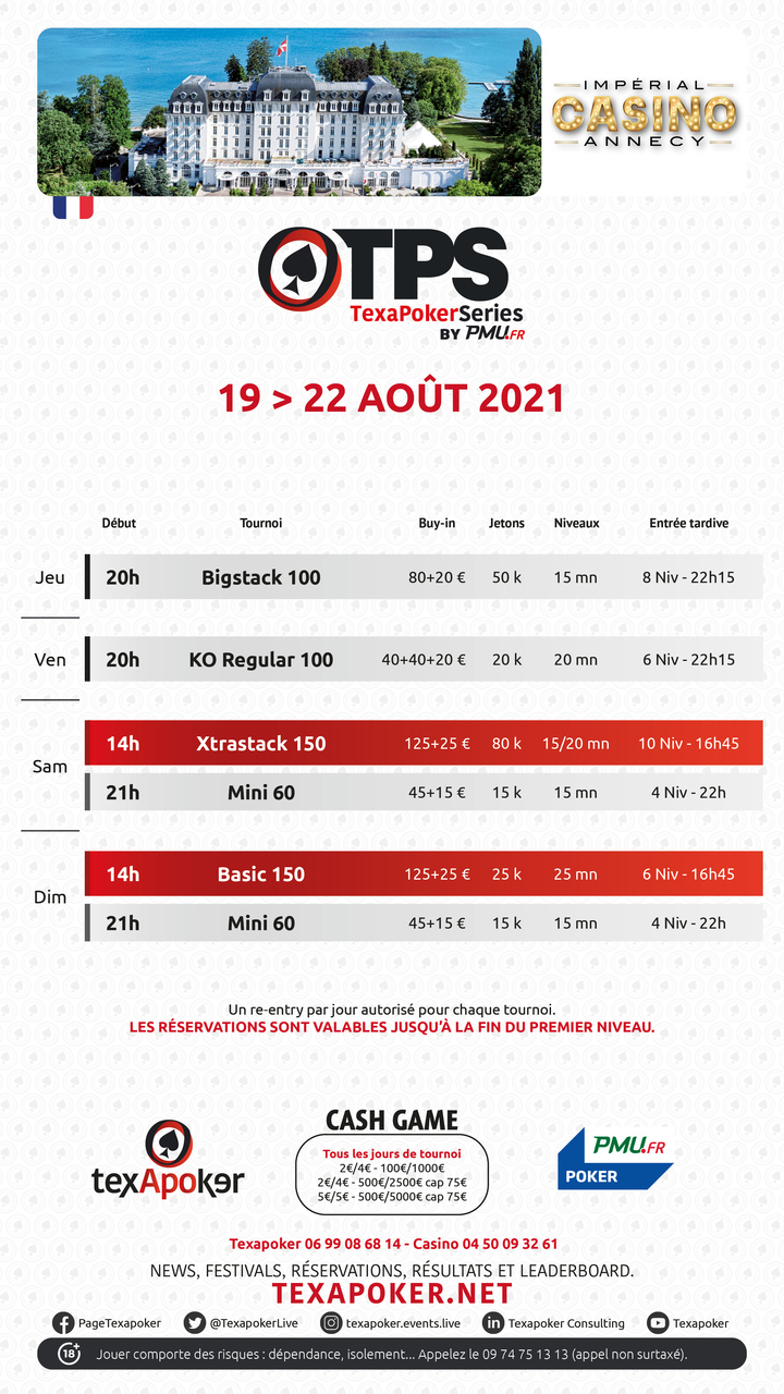 TexaPoker, PMU.fr et le l'Impérial Casino Annecy vous présentent leurs tournois réguliers !