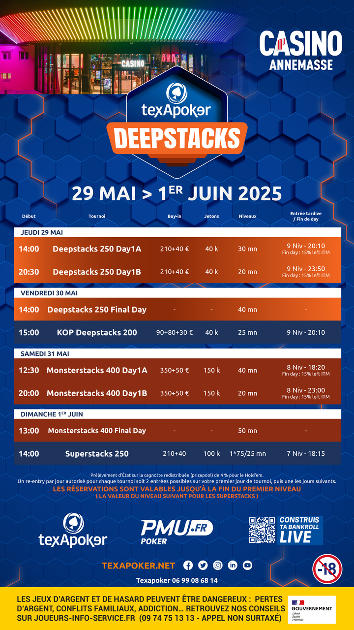 Retrouvez, en Main Event un Monsterstacks 400, avec 2 jours pour démarrer le tournoi ! De plus, plusieurs tournois annexes seront aussi au programme, comme un Deepstacks 250, un KOP Deepstacks 200, un Superstack 250 pour clôturer le festival !