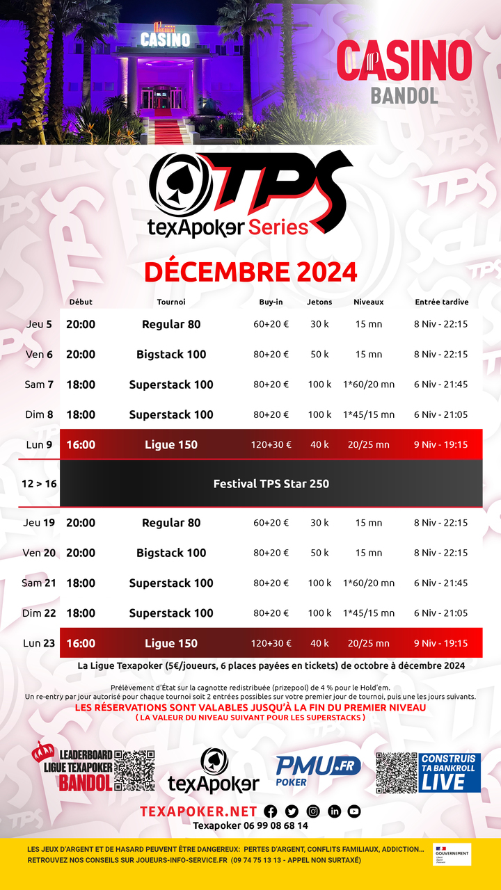 TexaPoker, PMU.fr et le Casino de Bandol vous présentent la Ligue TexaPoker, les tournois hebdomadaires à Bandol ! Les tickets remportés sur PMU.fr sont utilisables sur l'ensemble des tournois.