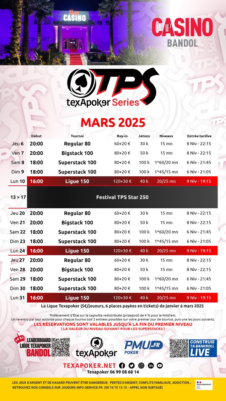 TexaPoker, PMU.fr et le Casino de Bandol vous présentent la Ligue TexaPoker, les tournois hebdomadaires à Bandol ! Les tickets remportés sur PMU.fr sont utilisables sur l'ensemble des tournois.