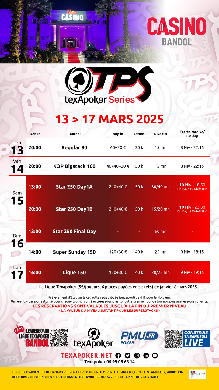 TexaPoker, PMU.fr et le Casino de Bandol vous présentent la Ligue TexaPoker, les tournois hebdomadaires à Bandol ! En partenariat avec PMU.fr, les tickets remportés sur PMU.fr sont utilisables sur l'ensemble des tournois.