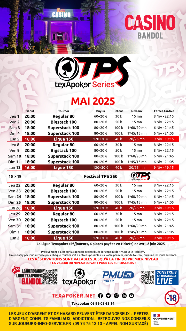 TexaPoker, PMU.fr et le Casino de Bandol vous présentent la Ligue TexaPoker, les tournois hebdomadaires à Bandol ! Les tickets remportés sur PMU.fr sont utilisables sur l'ensemble des tournois.