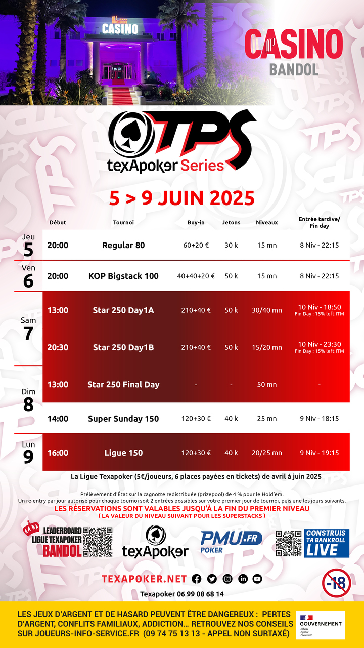 TexaPoker, PMU.fr et le Casino de Bandol vous présentent la Ligue TexaPoker, les tournois hebdomadaires à Bandol ! En partenariat avec PMU.fr, les tickets remportés sur PMU.fr sont utilisables sur l'ensemble des tournois.