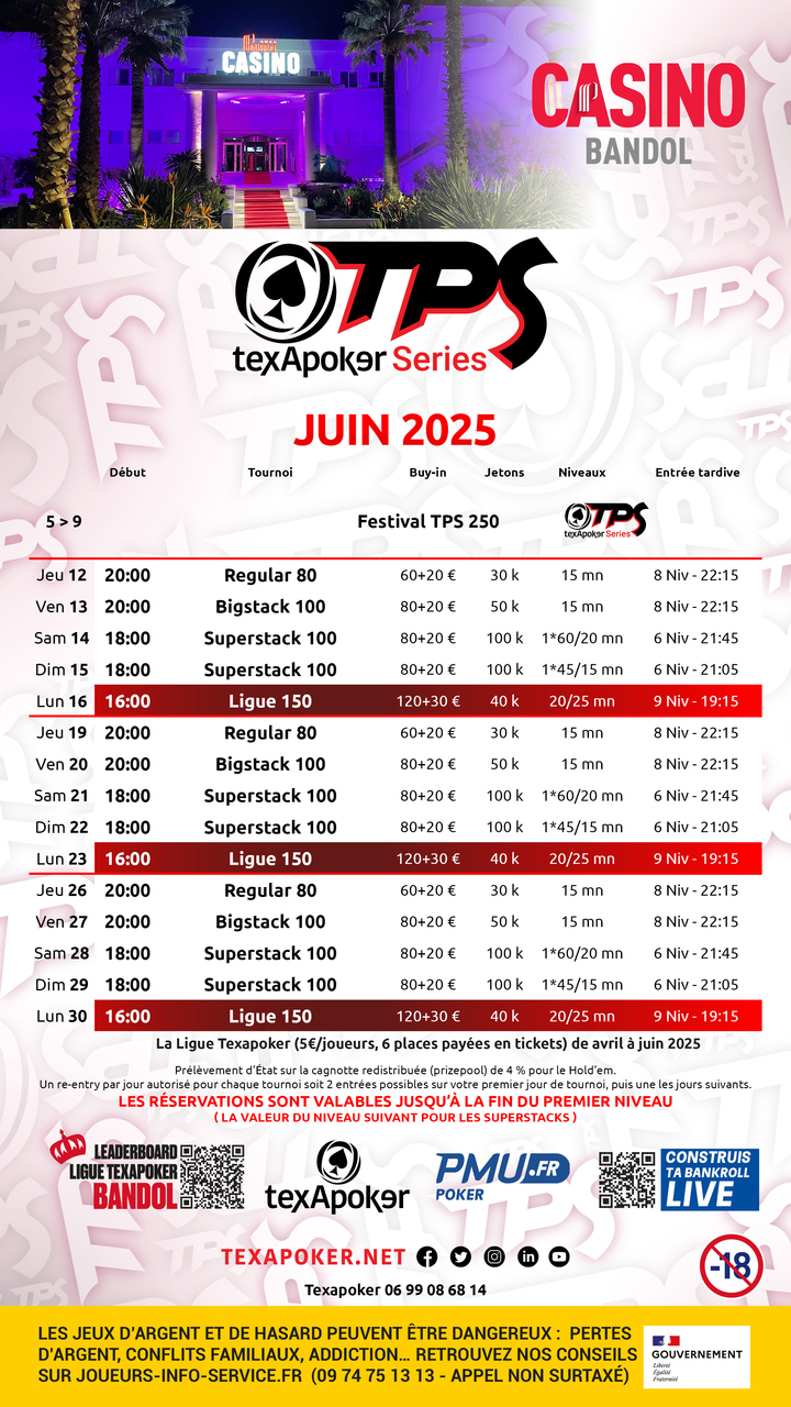 TexaPoker, PMU.fr et le Casino de Bandol vous présentent la Ligue TexaPoker, les tournois hebdomadaires à Bandol ! Les tickets remportés sur PMU.fr sont utilisables sur l'ensemble des tournois.