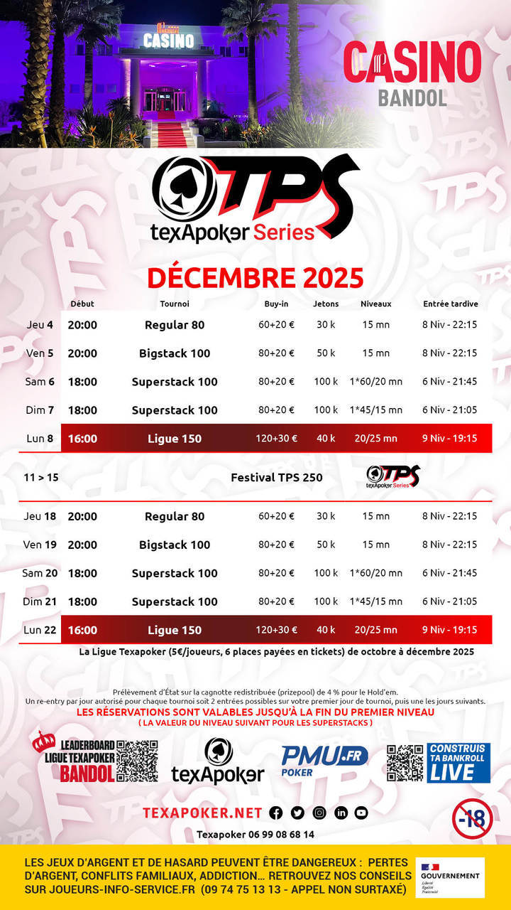 TexaPoker, PMU.fr et le Casino de Bandol vous présentent la Ligue TexaPoker, les tournois hebdomadaires à Bandol ! Les tickets remportés sur PMU.fr sont utilisables sur l'ensemble des tournois.