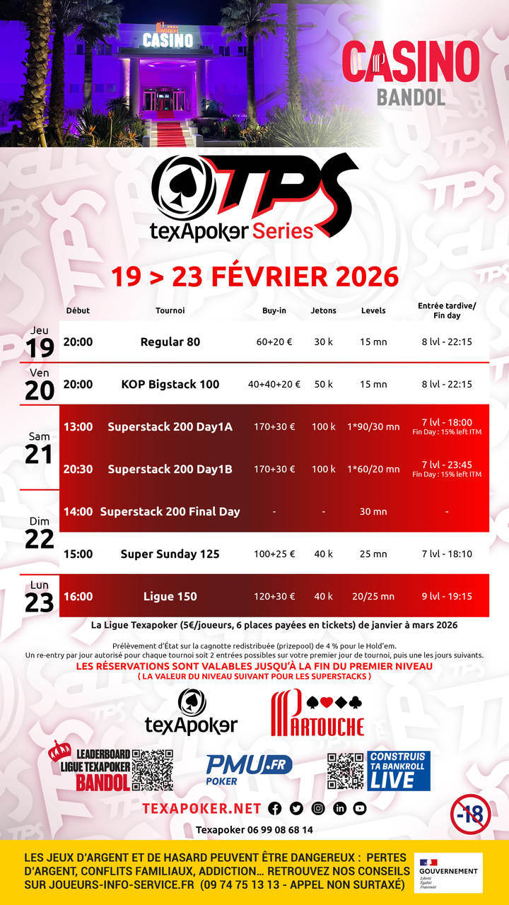 Les tournois TPS sont la marque de fabrique de Texapoker ! Comme sur tous les tournois TPS, les tickets remportés sur PMU.fr sont utilisables sur l'ensemble des tournois.