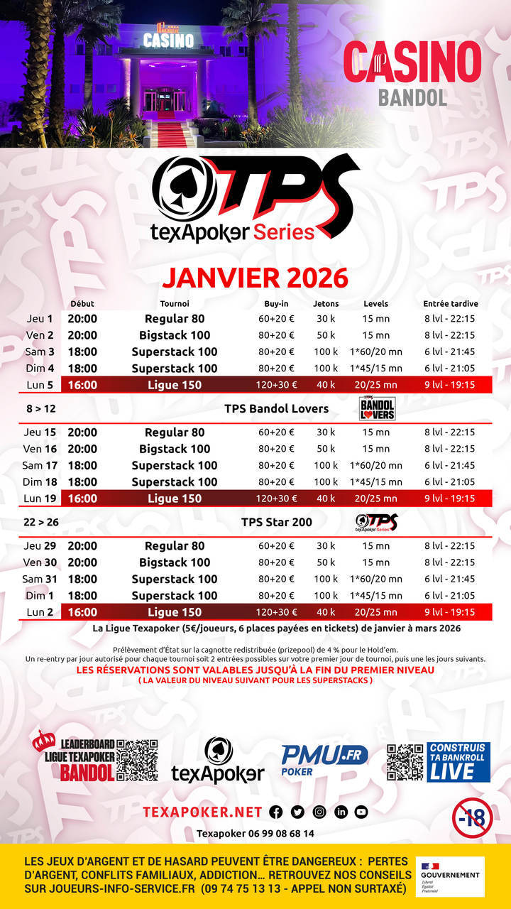 TexaPoker, PMU.fr et le Casino de Bandol vous présentent la Ligue TexaPoker, les tournois hebdomadaires à Bandol ! Les tickets remportés sur PMU.fr sont utilisables sur l'ensemble des tournois.