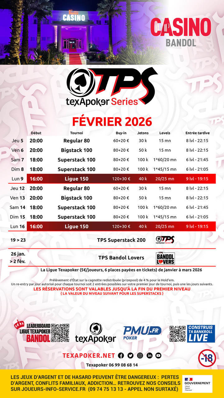 TexaPoker, PMU.fr et le Casino de Bandol vous présentent la Ligue TexaPoker, les tournois hebdomadaires à Bandol ! Les tickets remportés sur PMU.fr sont utilisables sur l'ensemble des tournois.