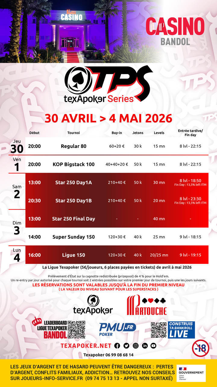Les tournois TPS sont la marque de fabrique de Texapoker ! Comme sur tous les tournois TPS, les tickets remportés sur PMU.fr sont utilisables sur l'ensemble des tournois.