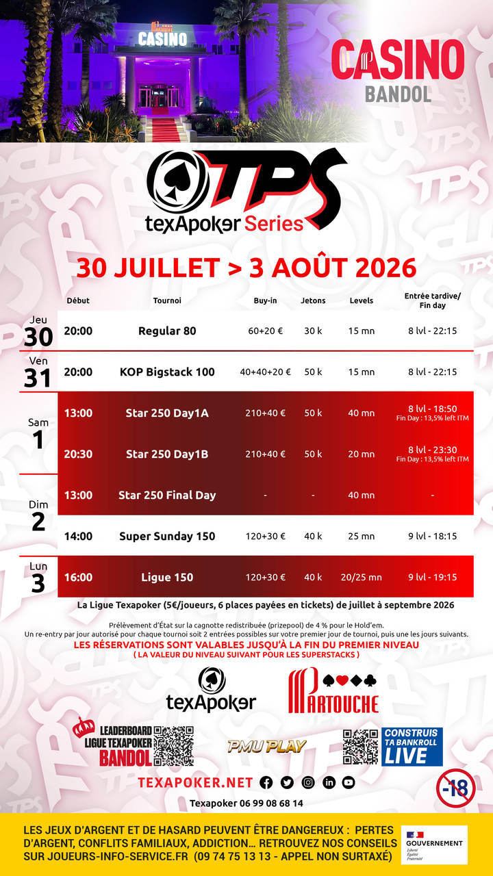 Retrouvez le Star 250, tournois phare de Texapoker, ainsi que les tournois réguliers du reste de la semaine !