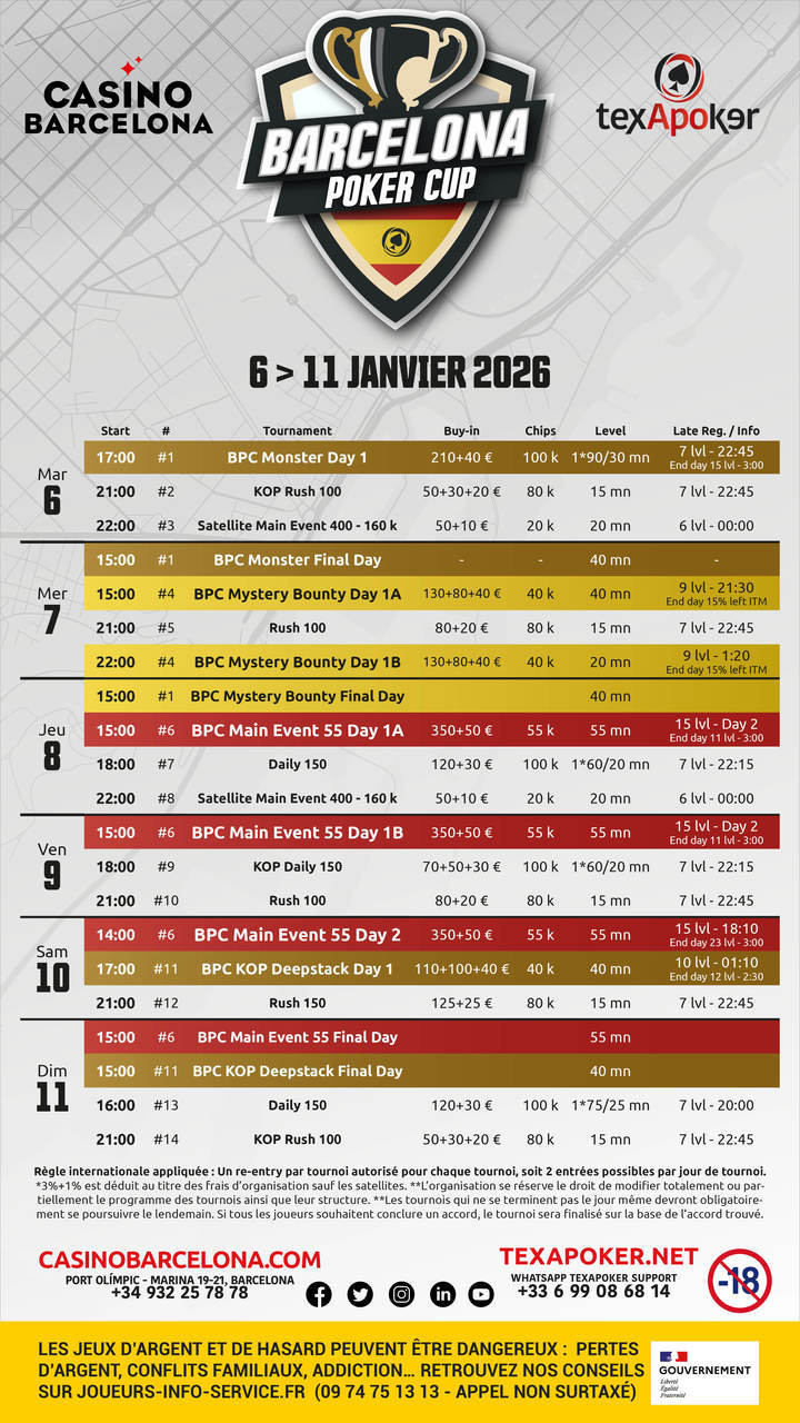 Vous pourrez retrouver Main Event le BPC à 400€, avec un stack de départ de 55 000 jetons à faire fructifier sur des niveaux de 55 minutes ! De nombreux tournois annexes seront mis en place, avec en ouverture un BPC Monster à 250€ sur deux jours, un BPC Mystery Bounty à 250€, des Rush et KOP Rush à 100 et 150€, tournois au format Turbo, ainsi que des Daily à 150€. Le festival sera clôturé avec un BPC KOP Deepstack à 250€ également !