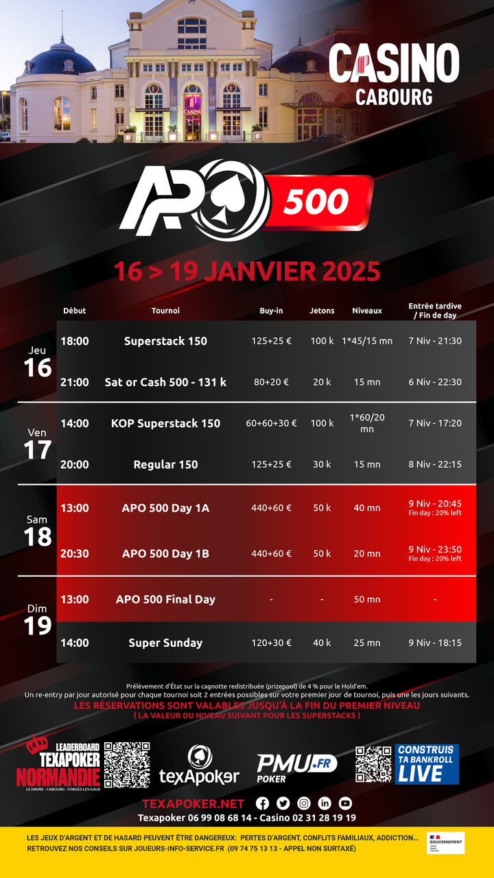 De retour au casino e Cabourg, Texapoker vous propose les APO 500 avec une structure sur 2 jours :