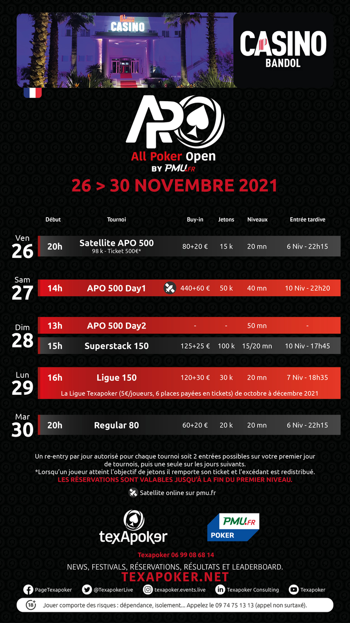 De retour à Bandol, Texapoker vous propose les APO 500, qui dureront du samedi au dimanche ! En plus d'un main event, vous pouvez retrouver un Superstack 150 et les tournois hebdomadaires du lundi et mardi.