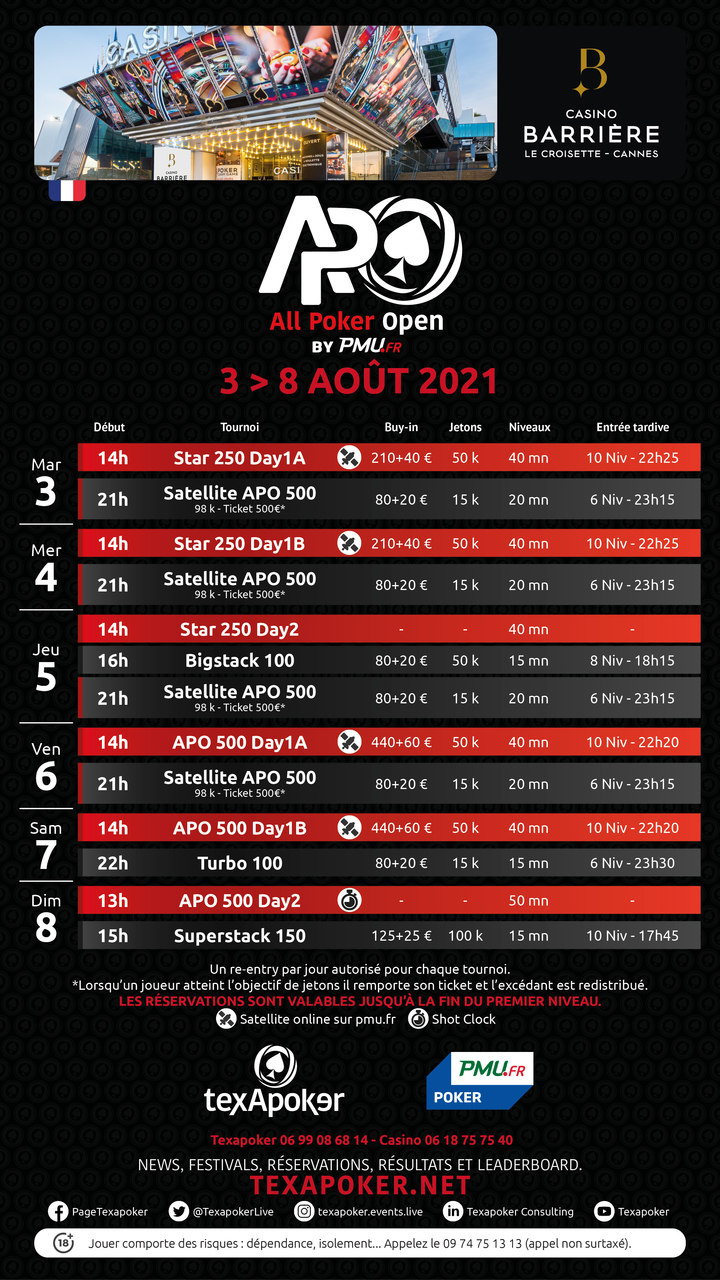 De retour à Cannes, Texapoker vous propose les APO 500, qui dureront du vendredi au dimanche ! En plus d'un main event, vous pouvez retrouver un Star 250 en ouverture du festival, le tournoi phase de Texapoker, ainsi que des tournois à plus grande profondeur de stack, comme le Bigstack 100 et le Superstack 150, et un turbo !