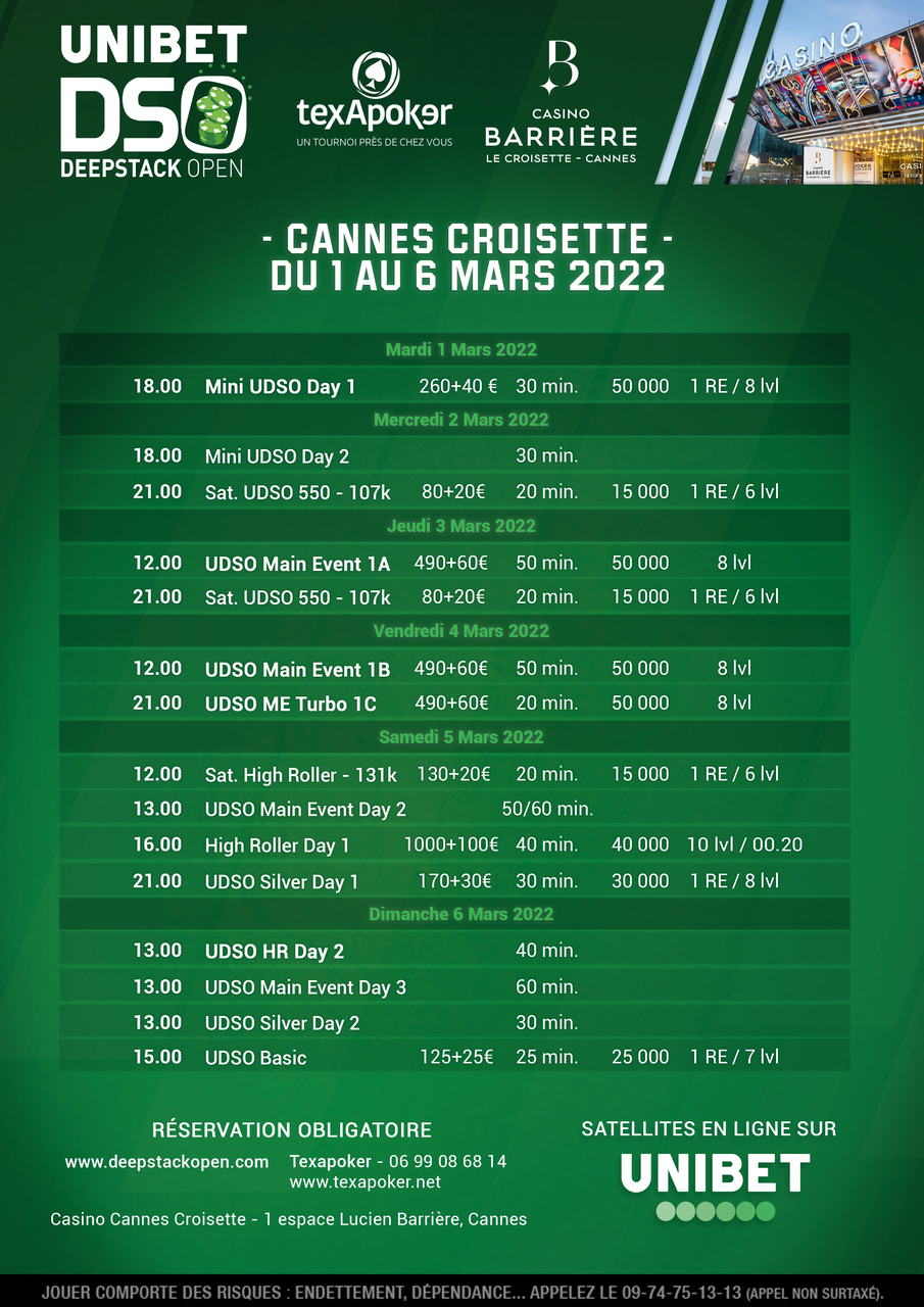 Retrouvez ainsi le Main Event à 550 €, qui sera accompagné de nombreux tournois, et des satellites vous permettant de gagner votre place. Un Mini UDSO afin d'ouvrir le bal, un High roller ainsi qu'un nouveau tournoi le Silver 200 et un Basic viendront se joindre à la fête !