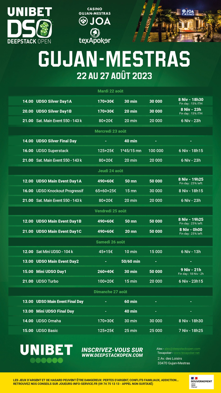 L' Unibet DeepStack Open esr de retour pour 2023, et toujours en partenariat avec Texapoker ! La première étape de ce circuit se déroulera au Casino JOA de Gujan-Mestras!