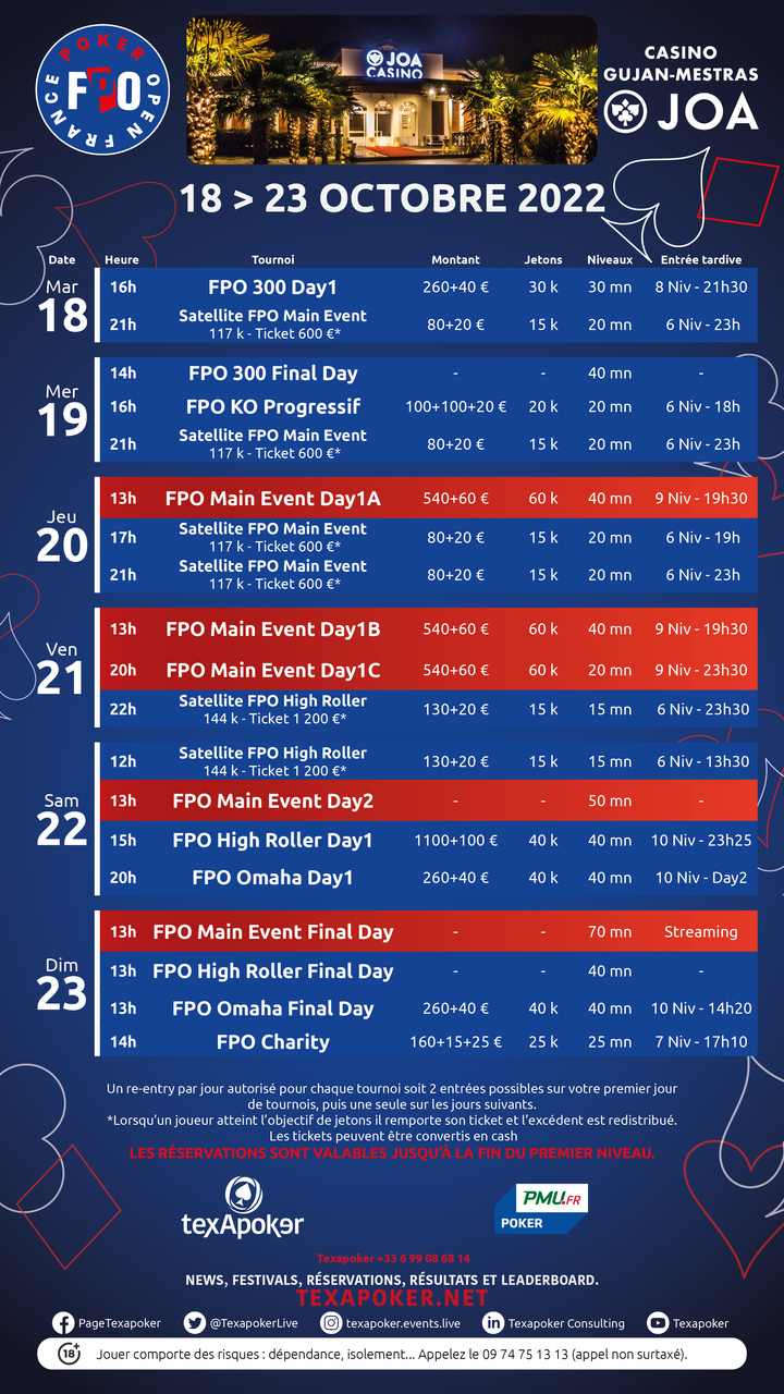 La nouvelle étape du France Poker Open par PMU.fr et Texapoker aura lieu au Casino JOA de Gujan Mestras ! Rendez-vous du 18 au 23 octobre pour participer aux FPO !