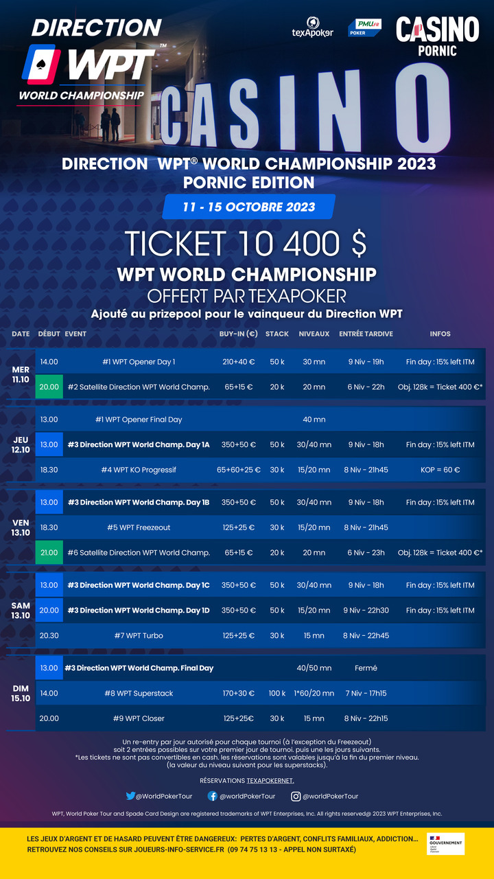 Rendez-vous pour le circuit intitulé « Direction WPT ». Chaque étape de ce festival propose un Main Event à 400€. Outre le prizepool global redistribué aux joueurs, le vainqueur du Main Event se verra offrir par Texapoker un ticket à 10 400$ pour disputer le WPT World Championship au Wynn à Las Vegas en décembre 2023. Mais aussi 3 nuits d'hôtel offertes au Wynn et un accès au lounge VIP WPT.