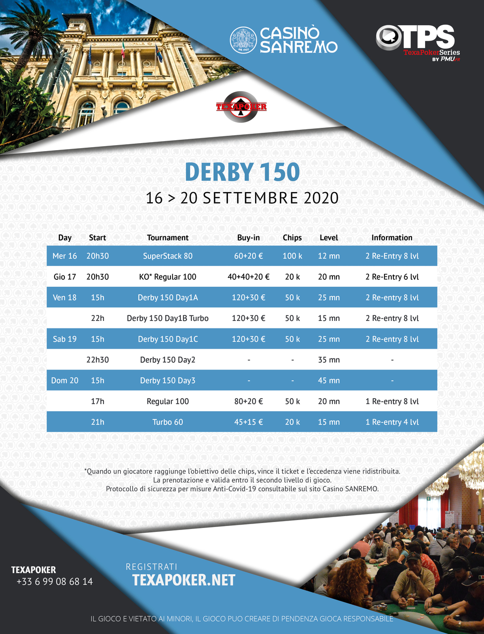 Découvrez notre nouveau format, le Derby 150 pour la reprise des tournois de poker en Italie !  Un Regular 100 et un Turbo 60 seront aussi disponible lors de ce festival.
