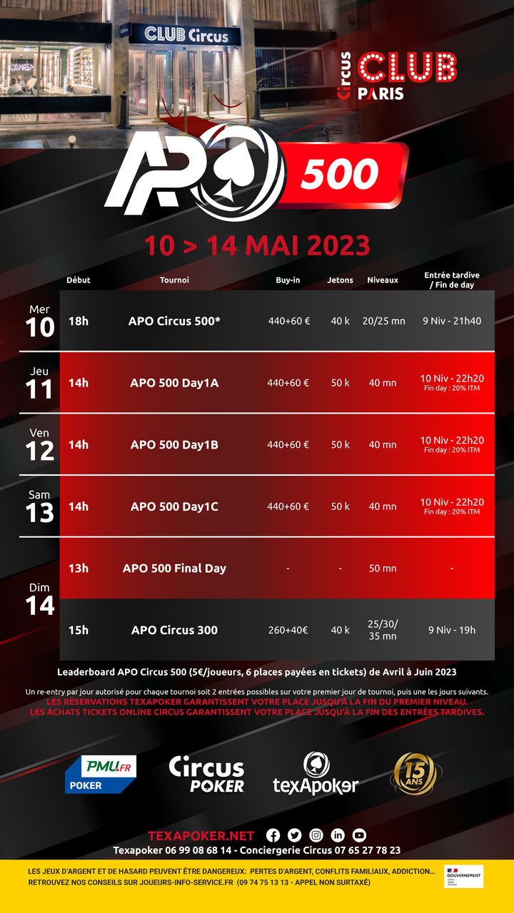 De retour au Club Circus Paris, Texapoker vous propose les APO 500, qui dureront du jeudi au dimanche ! Il y  aura également les tournois hebdomadaires des Circus Series mercredi et dimanche