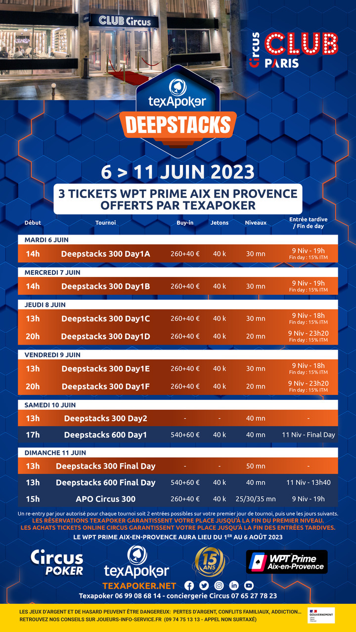 Découvrez ainsi en Main Event un Deepstacks 300 ainsi qu'un Deepstacks 600, et un APO Circus 300 pour clotûrer le festival.