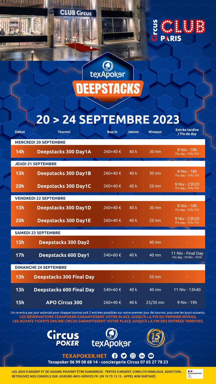 Découvrez ainsi en Main Event un Deepstacks 300 ainsi qu'un Deepstacks 600, et un APO Circus 300 pour clotûrer le festival