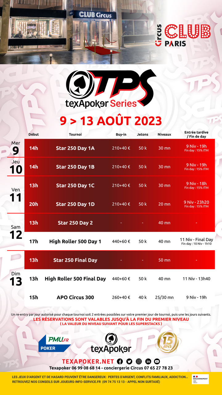Découvrez ainsi en Main Event un Star 250, tournoi phare de Texapoker, ainsi qu'un High Roller à 500€, et l'APO Circus 300 le dimanche.