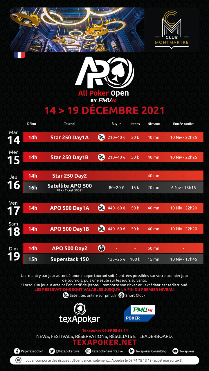 De retour au Club Montmartre, Texapoker vous propose les APO 500, qui dureront du vendredi au dimanche ! En plus du main event, vous pouvez retrouver un Star 250 en ouverture du festival, et un Superstack 150 pour clôturer le festival.