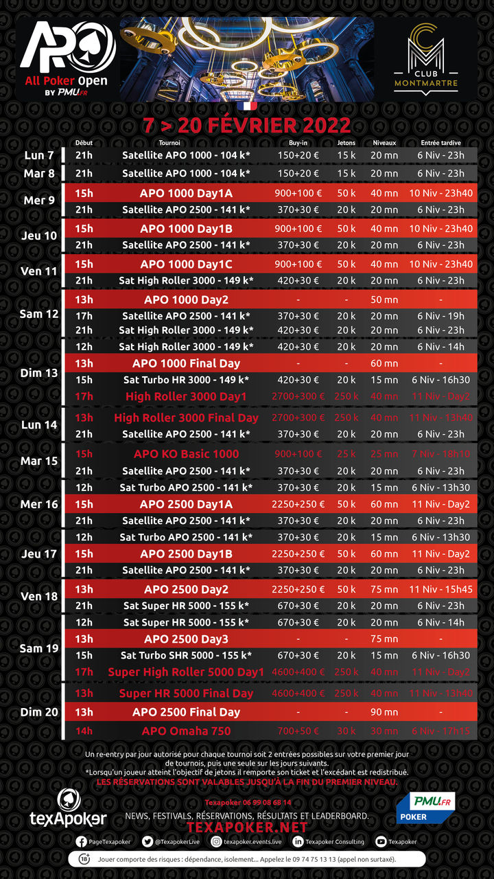 Rendez-vous donc au cœur de l'hiver parisien, du 7 au 20 février au Club Montmartre, pour une nouvelle édition de l'APO 2500 par PMU.fr avec son Main Event à 2 500 euros et ses nombreux sides events. Au programme, les Jours 1A et 1B les mercredi 16 et jeudi 17 février puis un Jour 2 le vendredi 18. Si les inscriptions tardives seront possibles jusqu'à la fin du onzième niveau au Jour 2, les places payées seront atteintes en fin de deuxième journée avant un Jour 3 le samedi 19 février. Attendez-vous à une structure profonde exceptionnelle avec 50 000 jetons de départ et des niveaux de 60 minutes au Jour 1 puis 75 minutes dès le Jour 2 et 90 minutes au Jour final le dimanche 20 février.