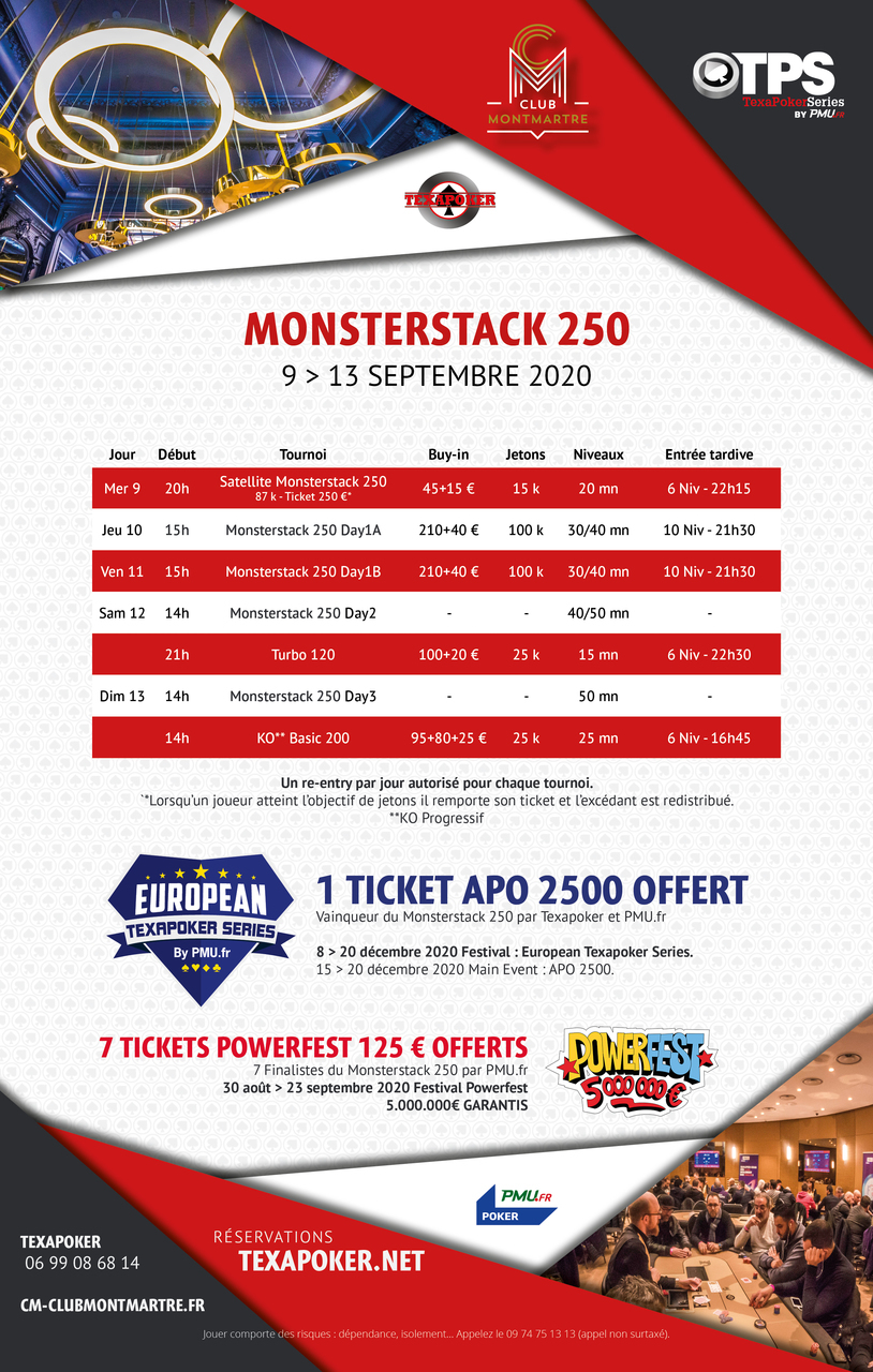 Retrouvez ainsi au Club Montmartre l'immanquable Monsterstack 250 ou encore le KO Progressif Basic à 200€.