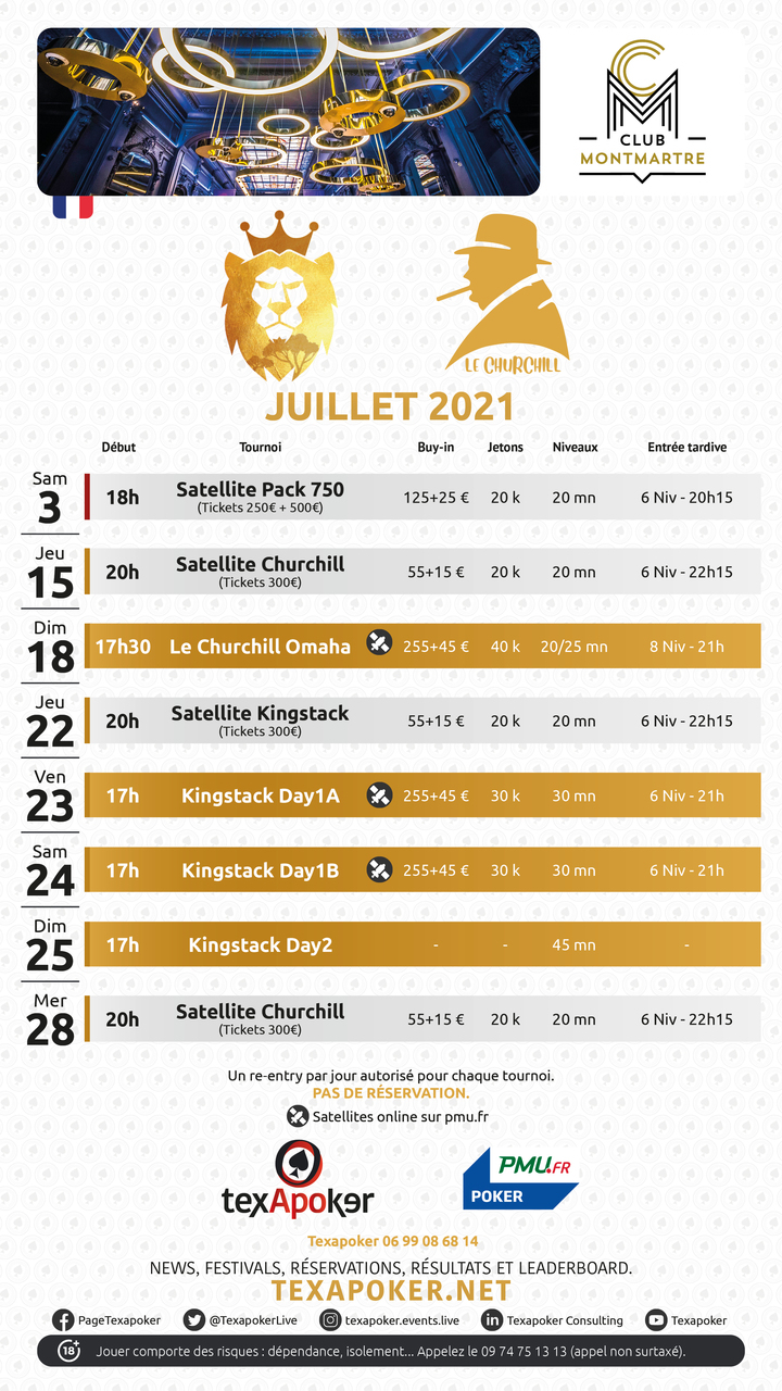 Retrouvez parmi ces tournois le Churchill Omaha 300, ainsi que le Kingstack 300 ! Un Satellite Pack 750 est mis en place également, vous permettant de gagner un ticket d'une valeur de 250 € et un autre de 500 €, pour participer à l'APO 500 et au Star 250 !