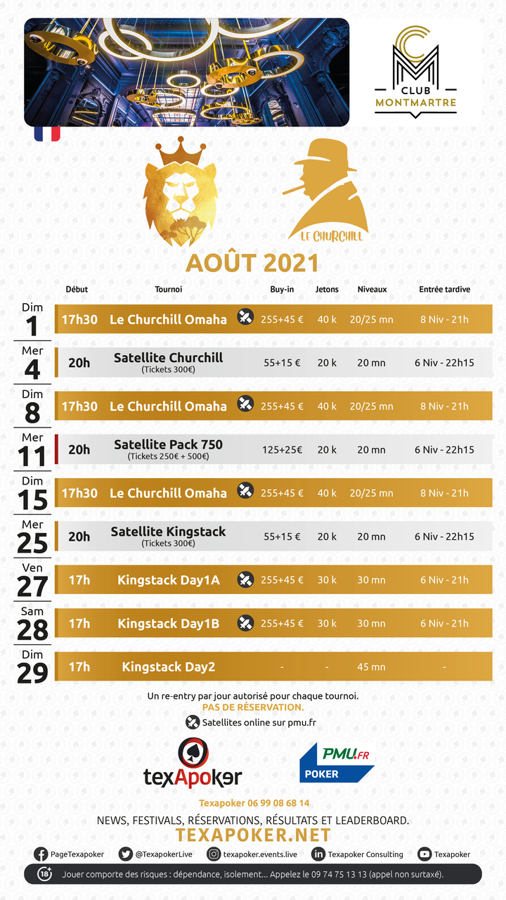 Retrouvez parmi ces tournois le Churchill Omaha 300, ainsi que le Kingstack 300 ! Un Satellite Pack 750 est mis en place également, vous permettant de gagner un ticket d'une valeur de 250 € et un autre de 500 €, pour participer à l'APO 500 et au Star 250 !