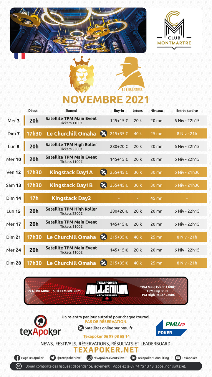 Retrouvez parmi ces tournois le Churchill Omaha 250, ainsi que le Kingstack 300 ! Des satellites pour les Texapoker Millenium by PokerStars seront également mis en place, pour le Main Event, et le High Roller !